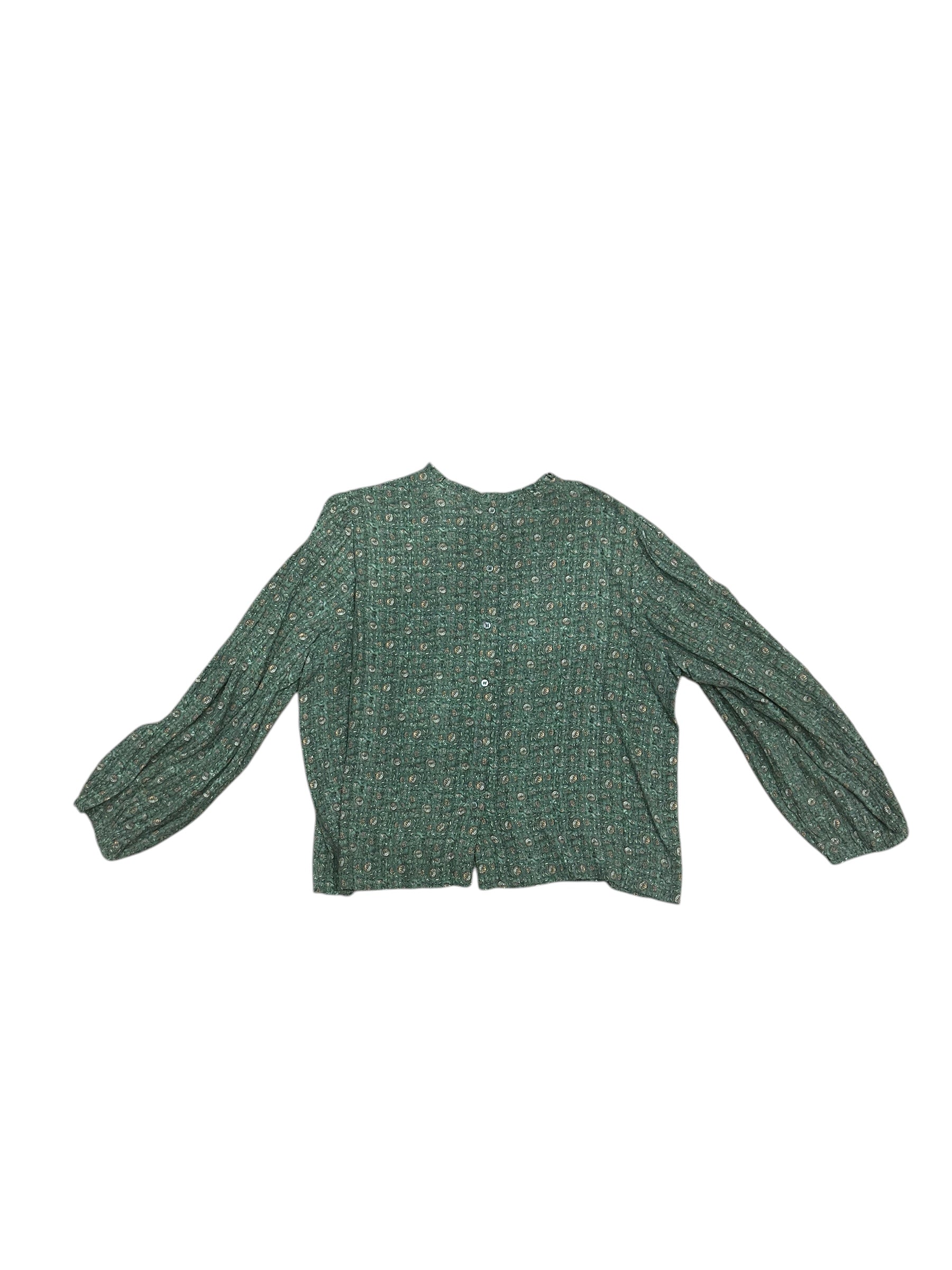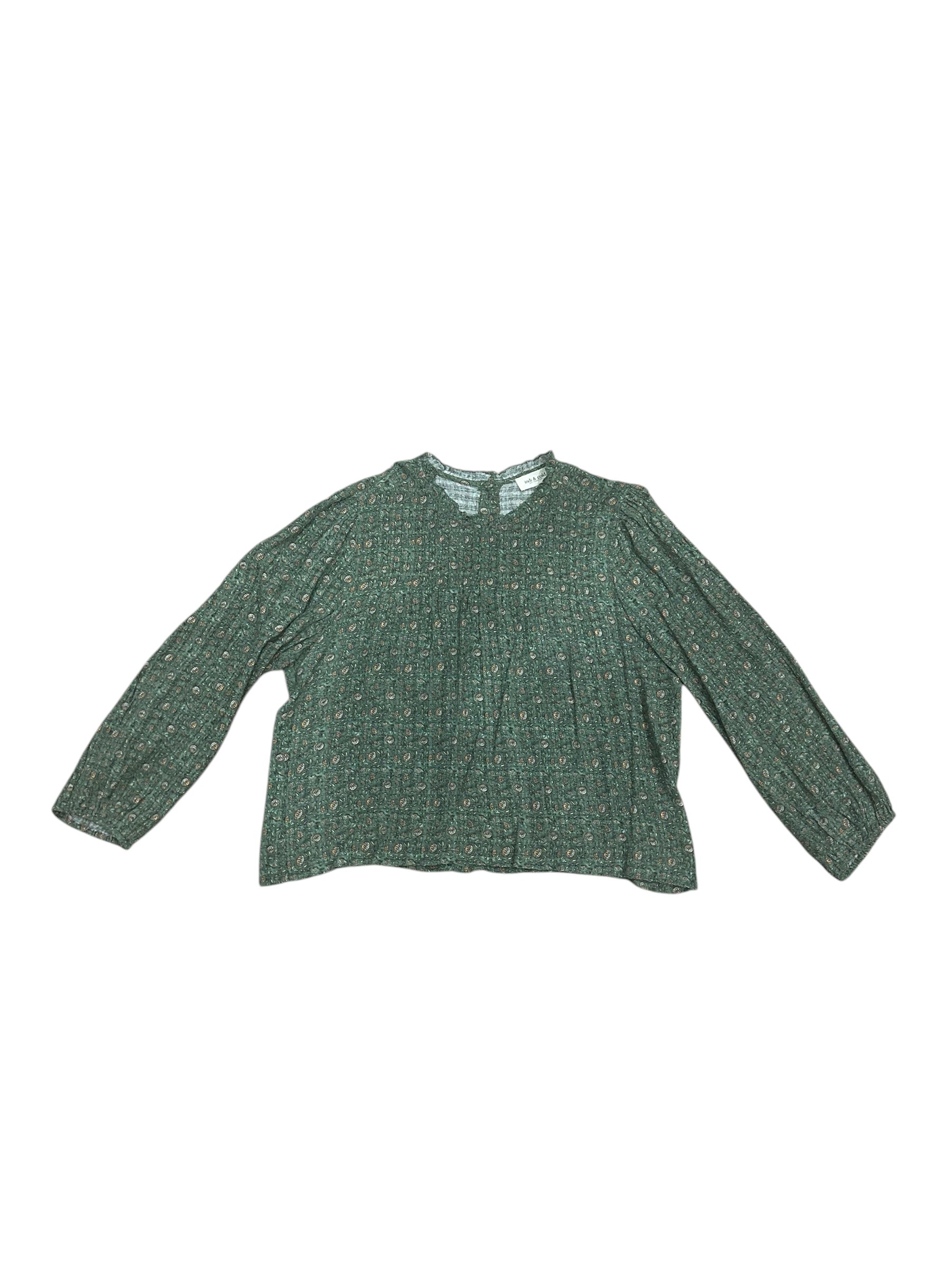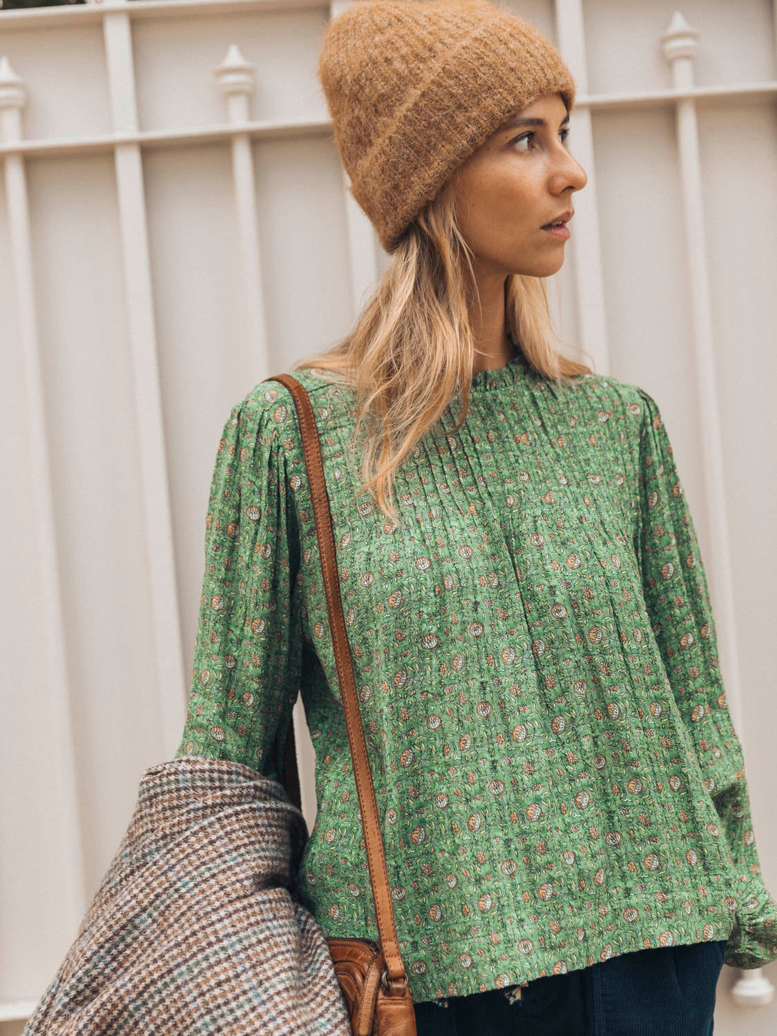 - Hombro encajado con ligero frunce, manga larga con puño engomado y abullonado