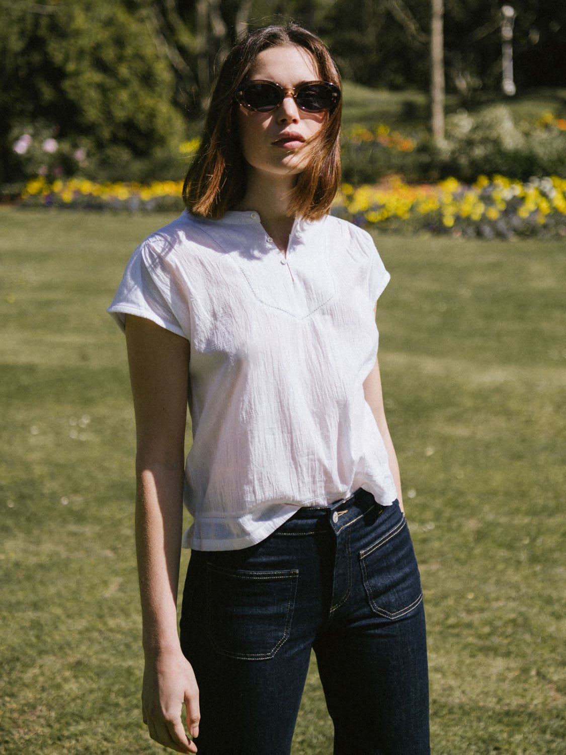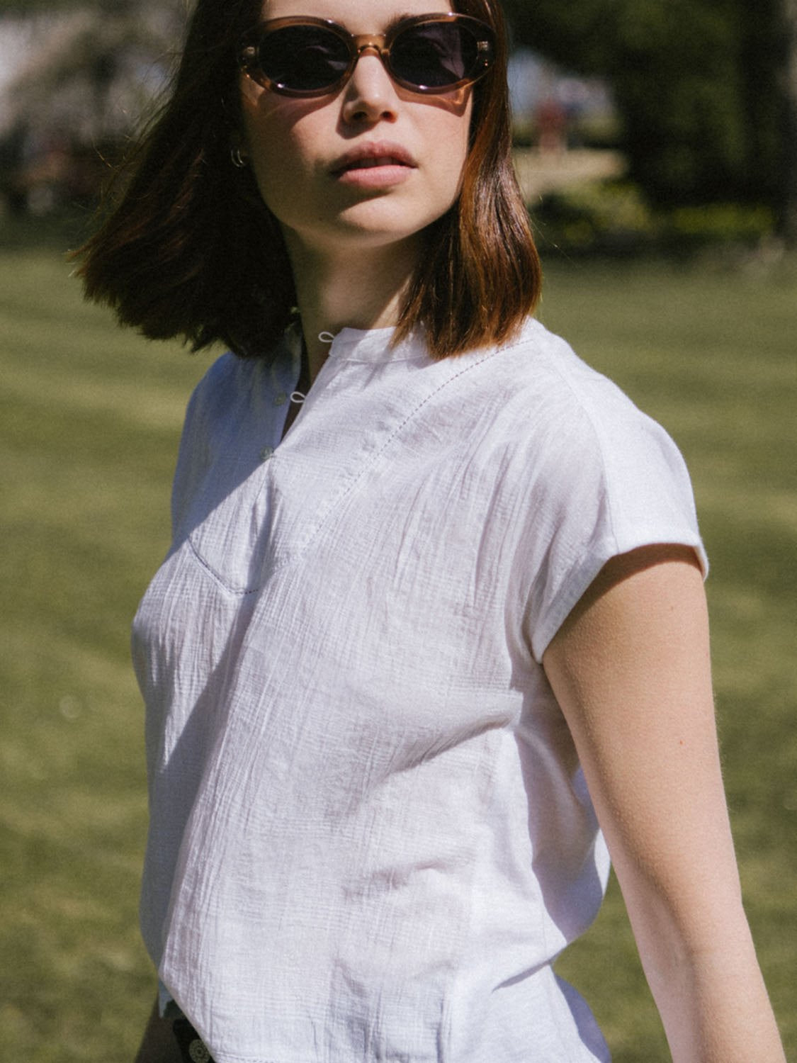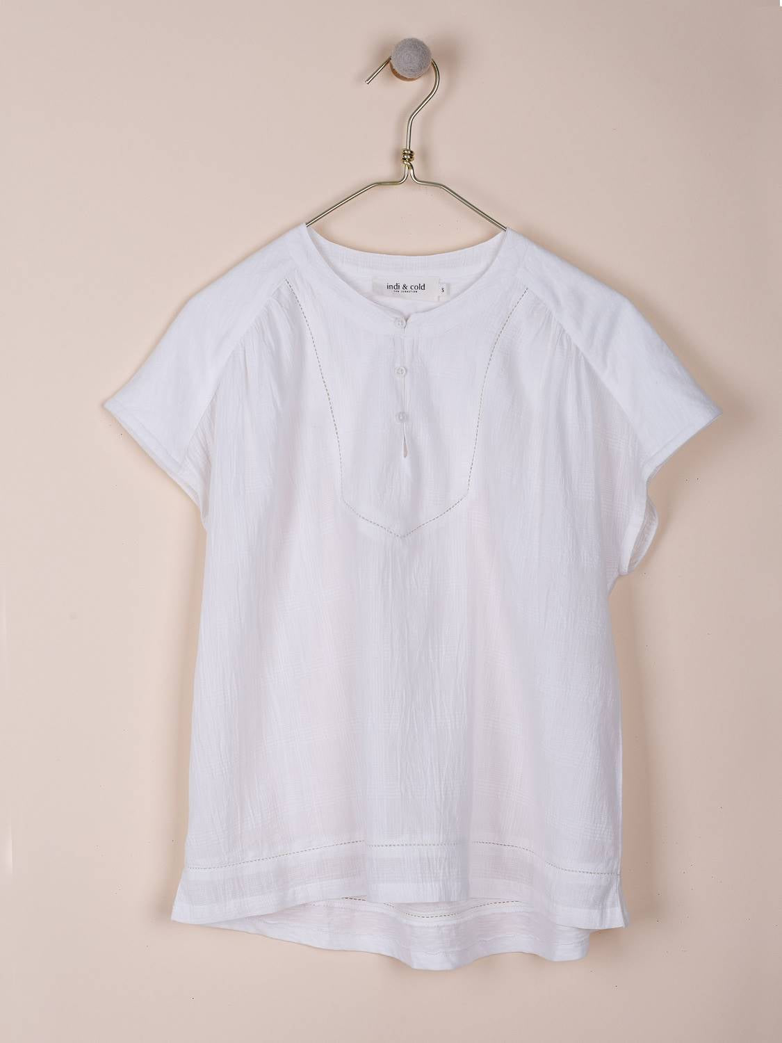 Camiseta combinada en falso liso de algodón, con cuello redondo y hombro marcado para realzar la silueta,ideal para combinar en tu día a día con pantalones estilo flare y nuestras palas de yute.