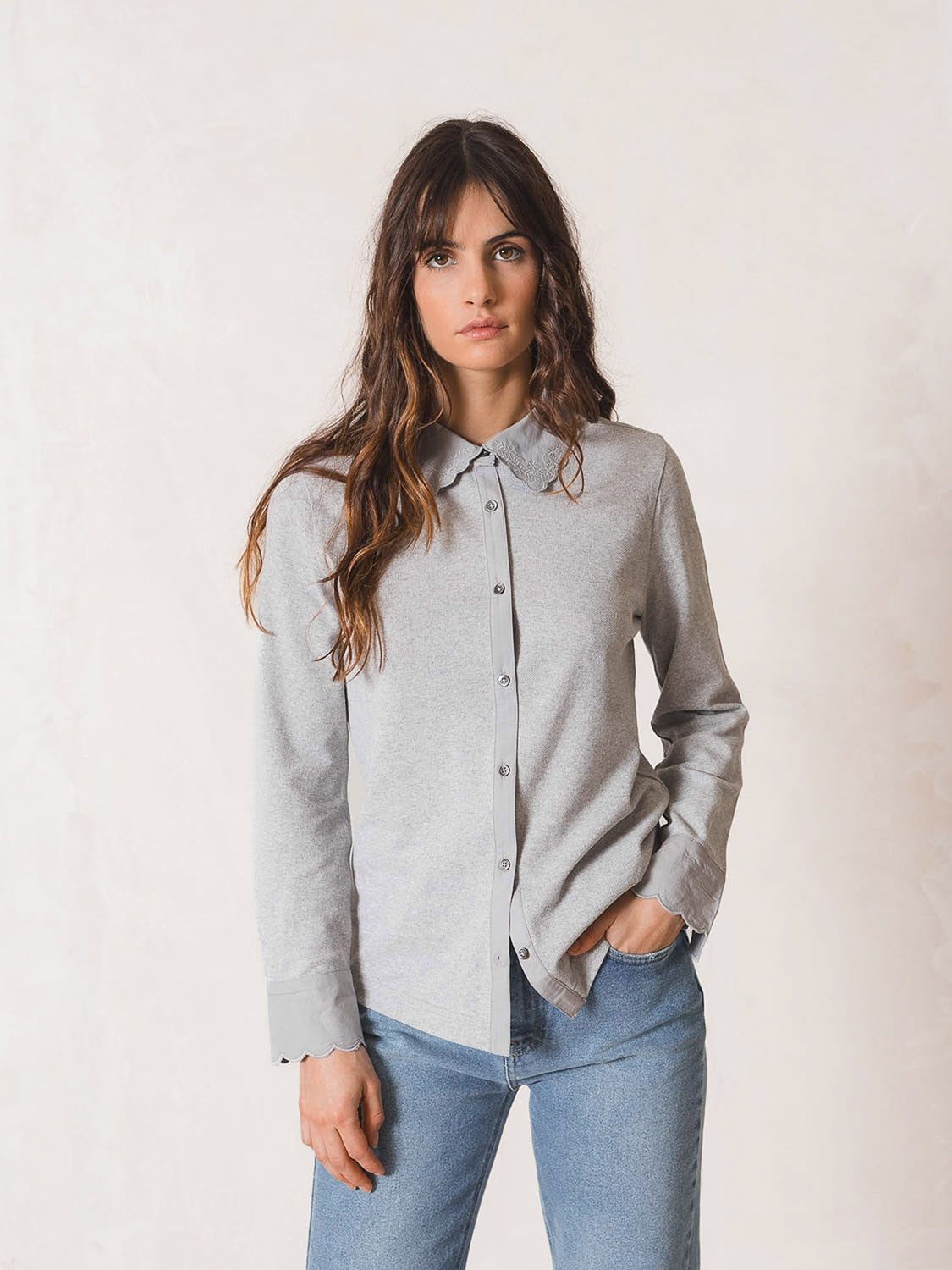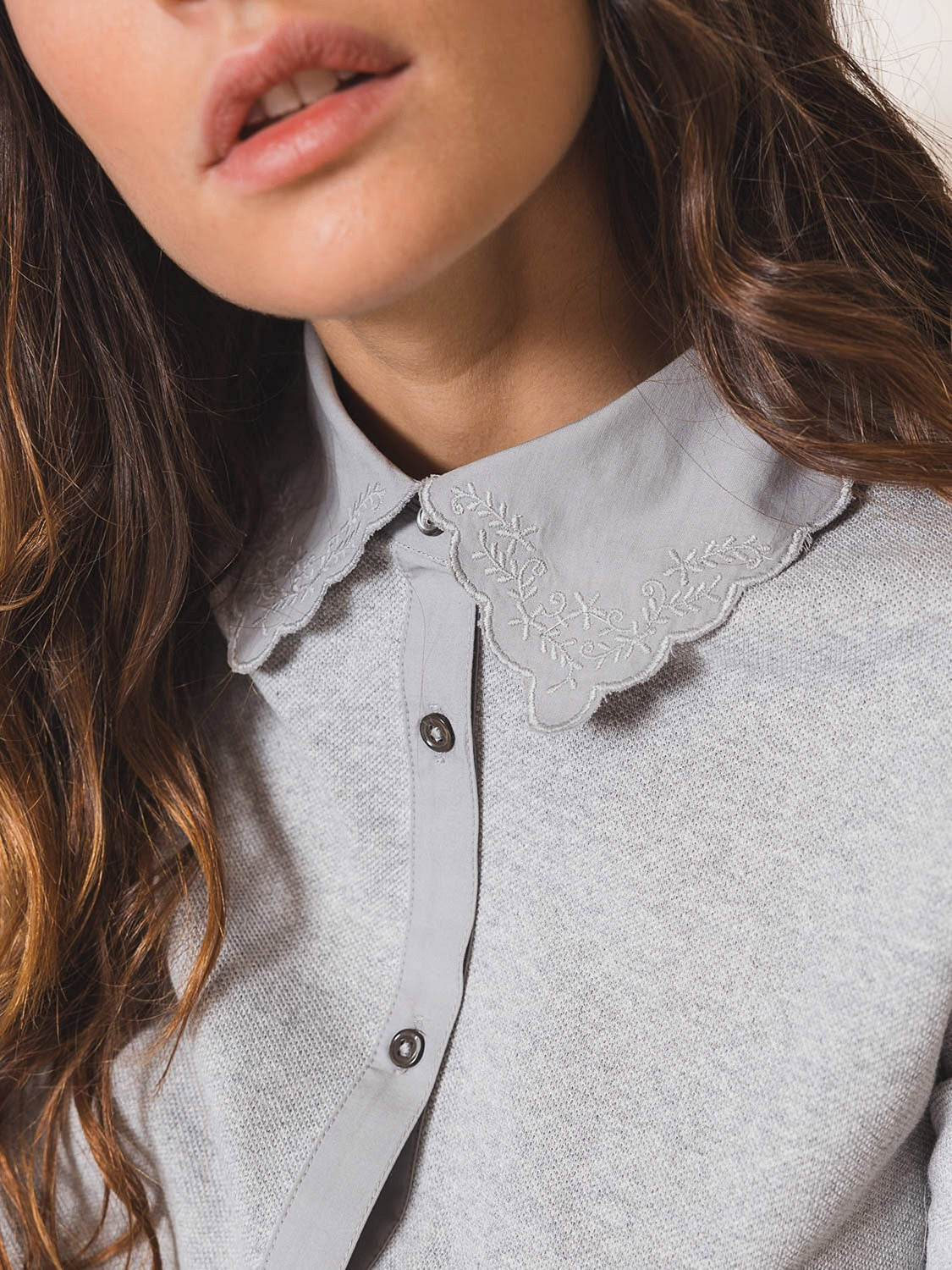- Cuello y puños en piqué de algodón con detalles bordados al tono