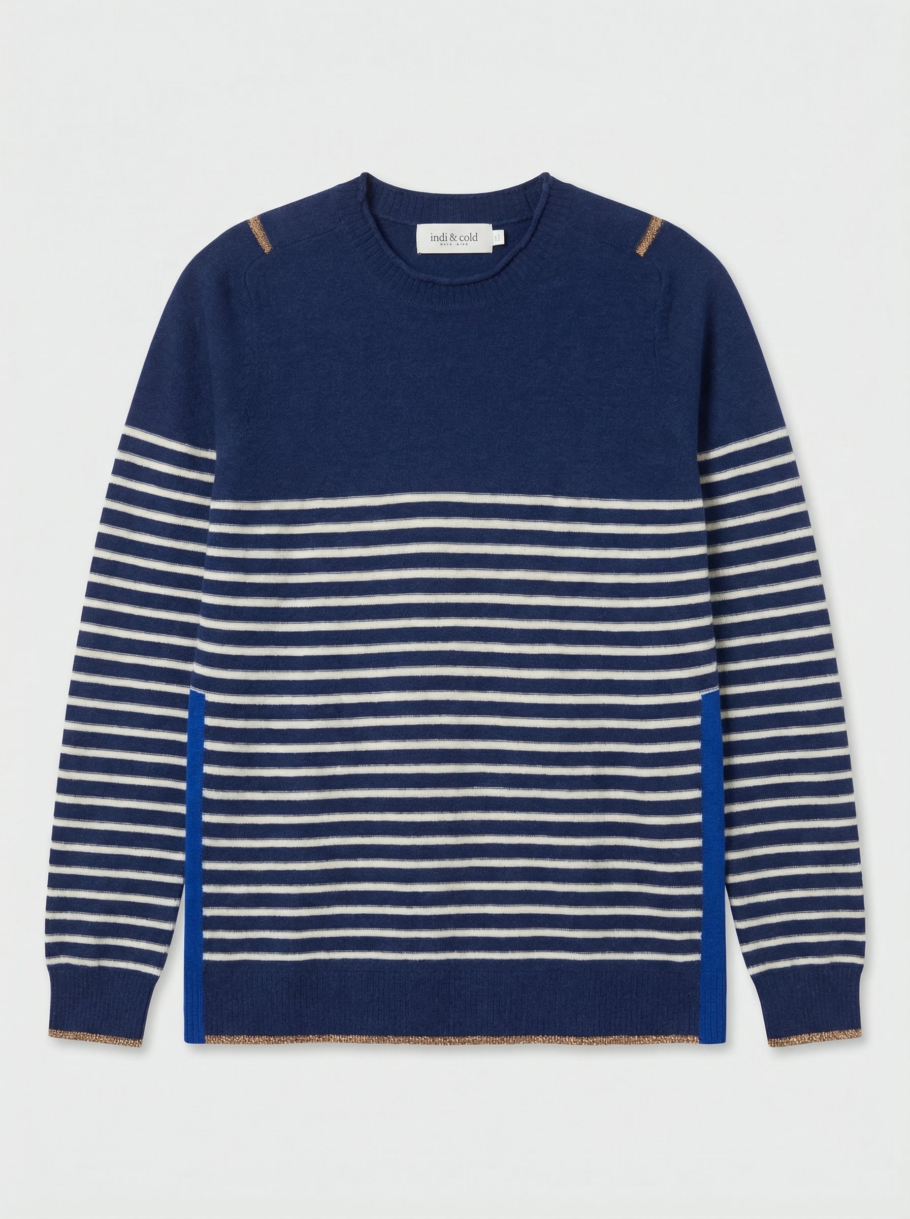 Jersey azul marino a rayas blancas. Detalles lurex en puños y bajo.