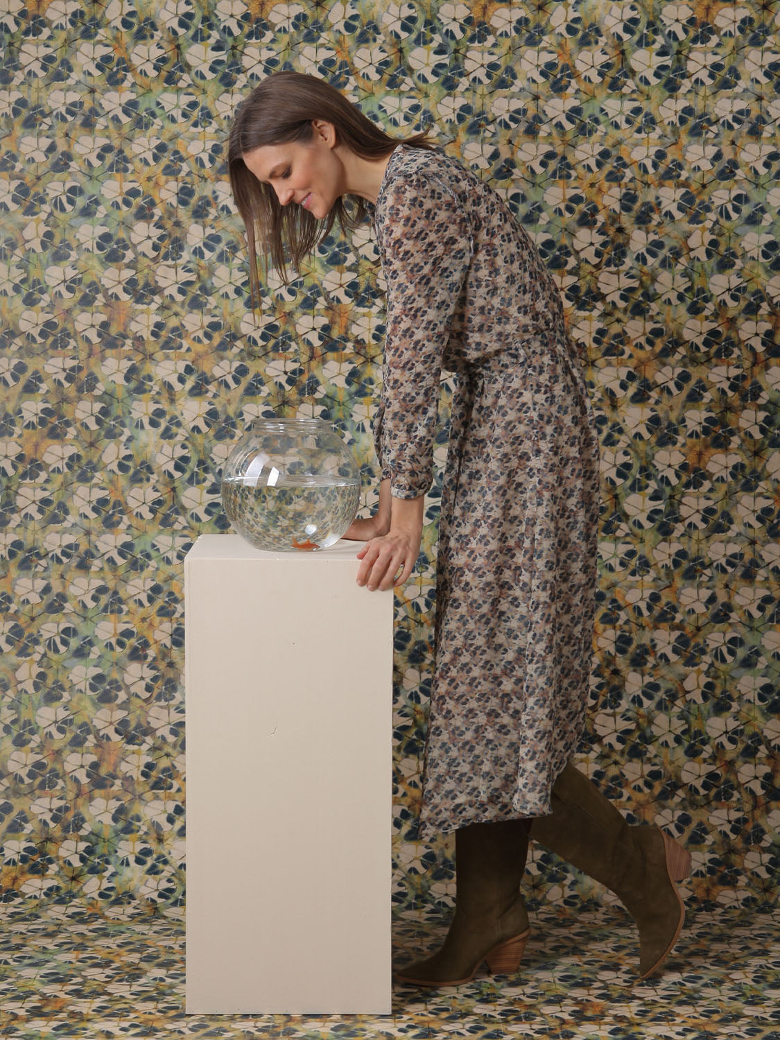 VESTIDO LARGO ESTAMPADO CALEIDOSCOPIO EN GEORGETTE.