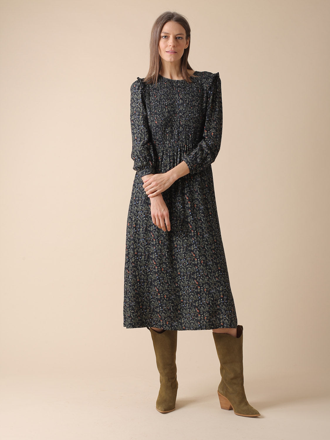VESTIDO MIDI EN FALSO LISO DE VISCOSA Y ESTAMPACIÓN DIGITAL.