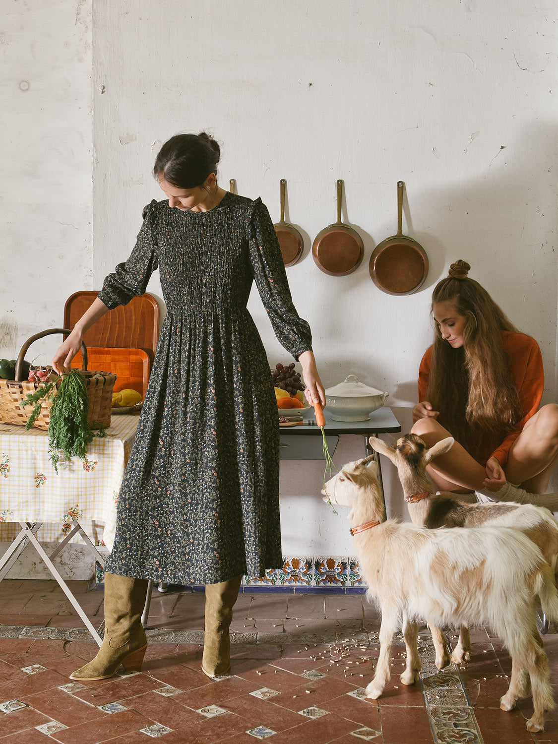 VESTIDO MIDI EN FALSO LISO DE VISCOSA Y ESTAMPACIÓN DIGITAL.