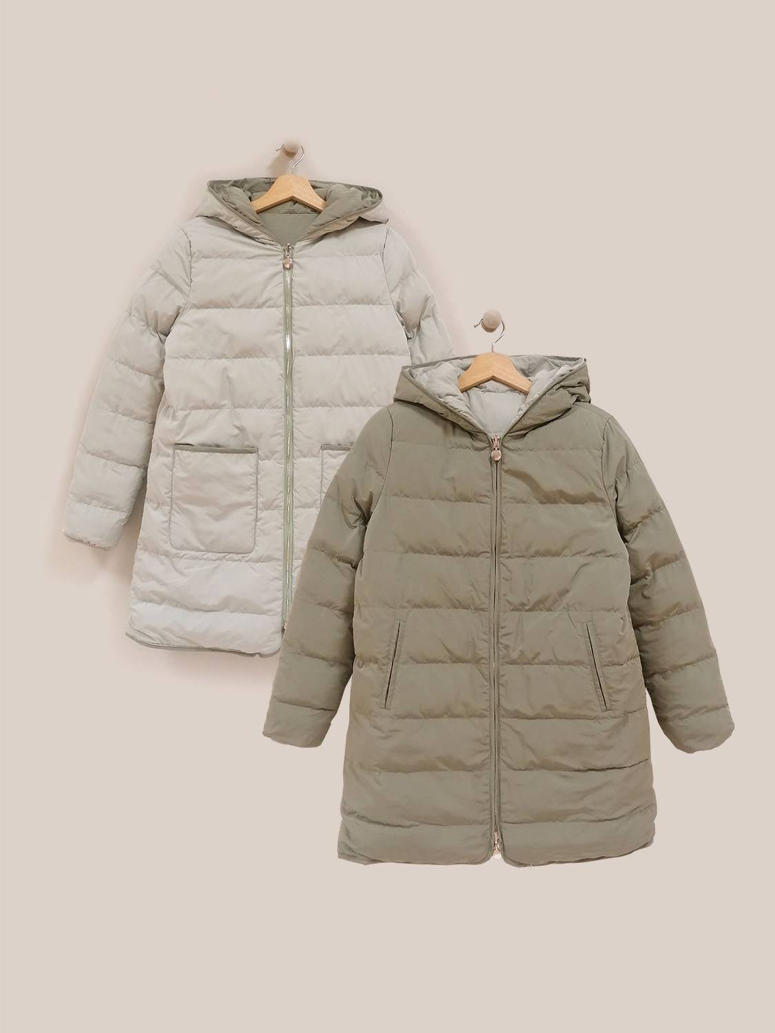 PLUMÍFERO MEDIANO REVERSIBLE CON CAPUCHA Y FIBRAS RECICLADAS 100%.