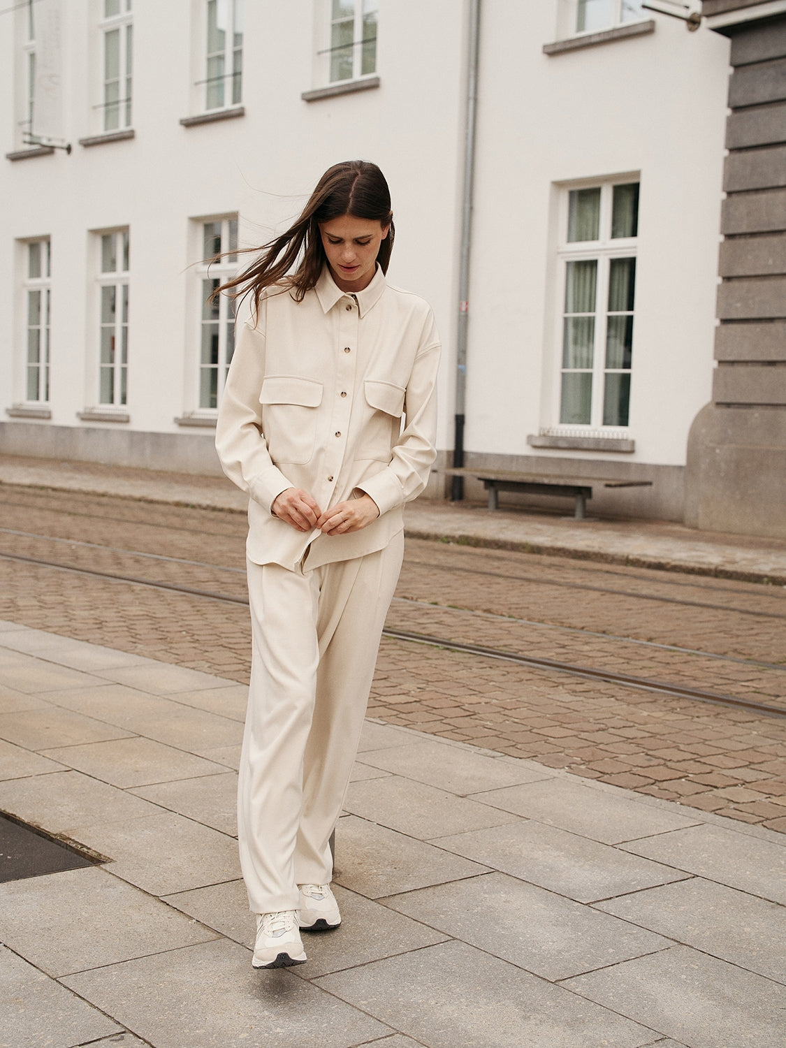 - Pantalón de talle medio y cierre de cremallera con corchetes interiores