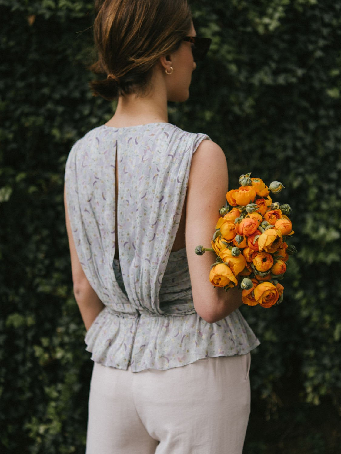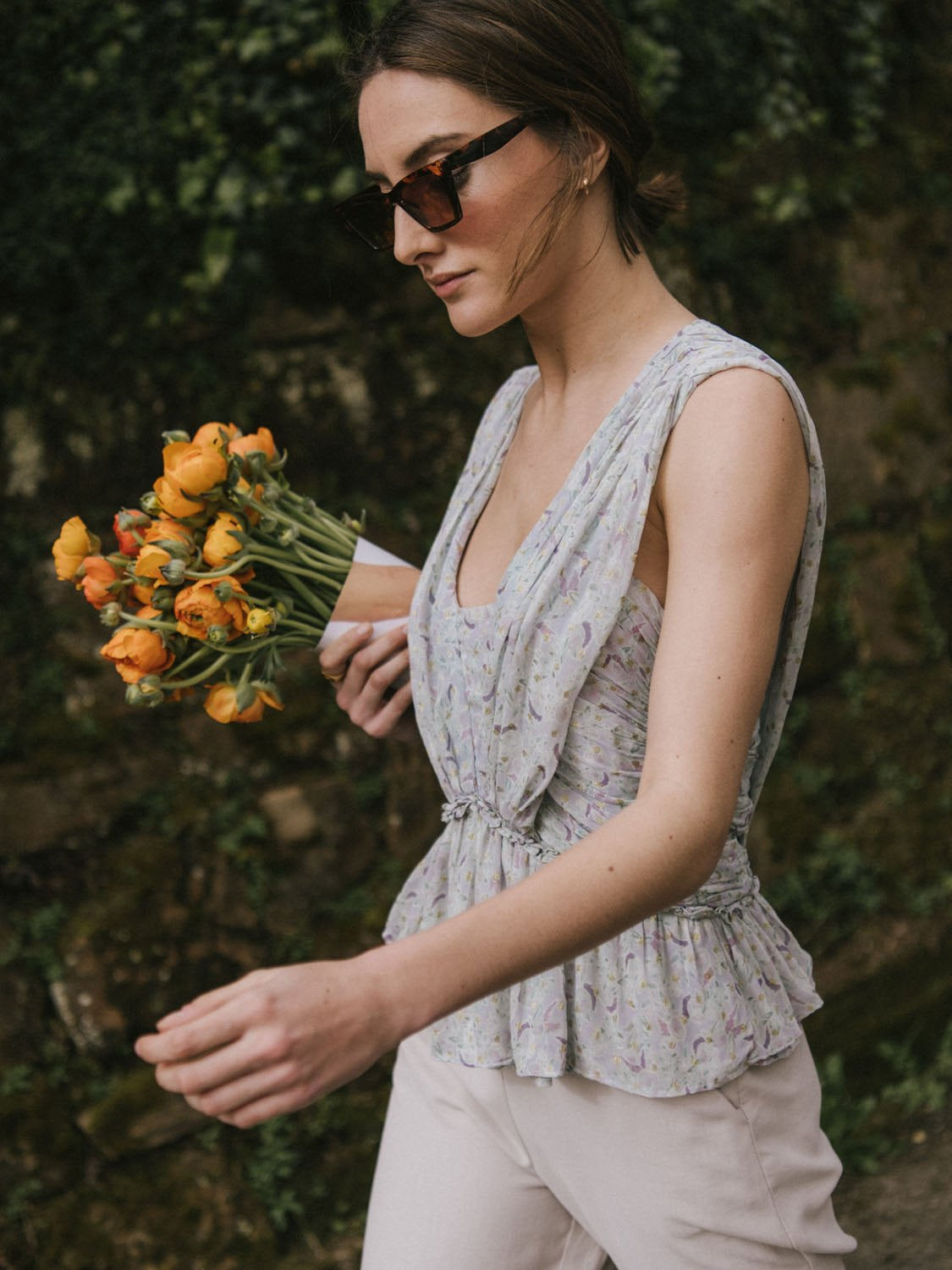 TOP ASIMETRICO DRAPEADO EN ESTAMPADO FLORAL.