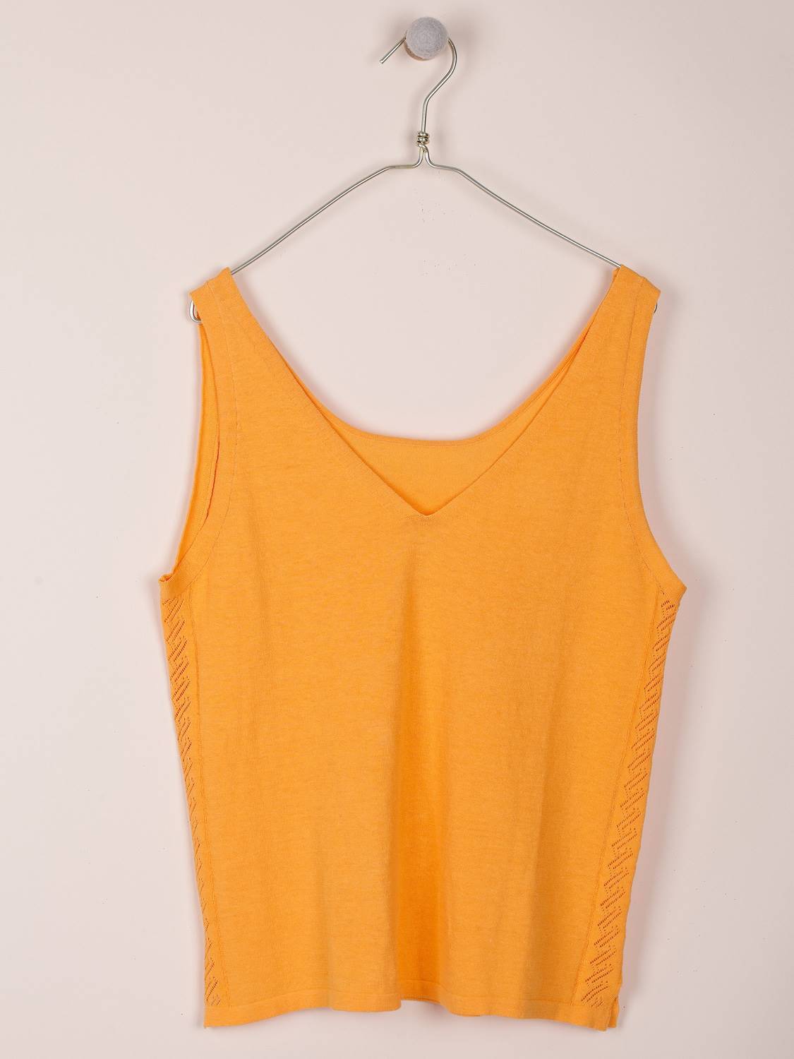 Este top de punto es un básico no tan básico. Forma parte de Terra por el origen sostenible de su tejido en algodón BCI, y el desagujado en los laterales es el sello indi de cada prenda.