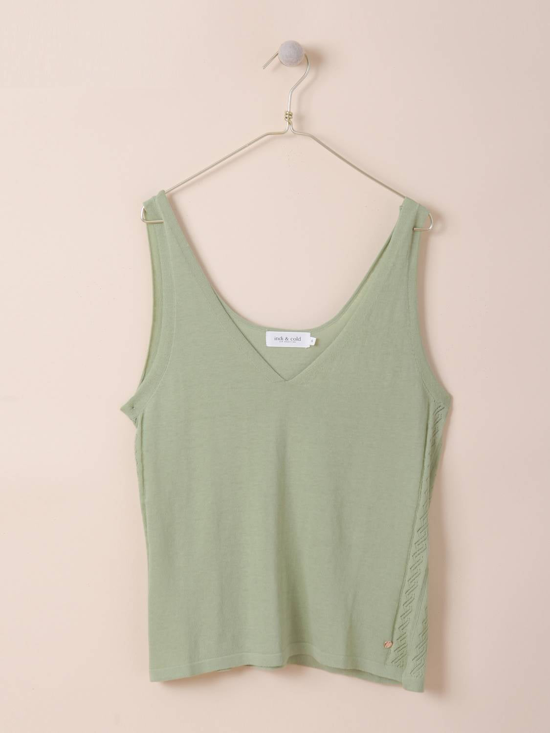 Este top de punto es un básico no tan básico. Forma parte de Terra por el origen sostenible de su tejido en algodón BCI, y el desagujado en los laterales es el sello indi de cada prenda.