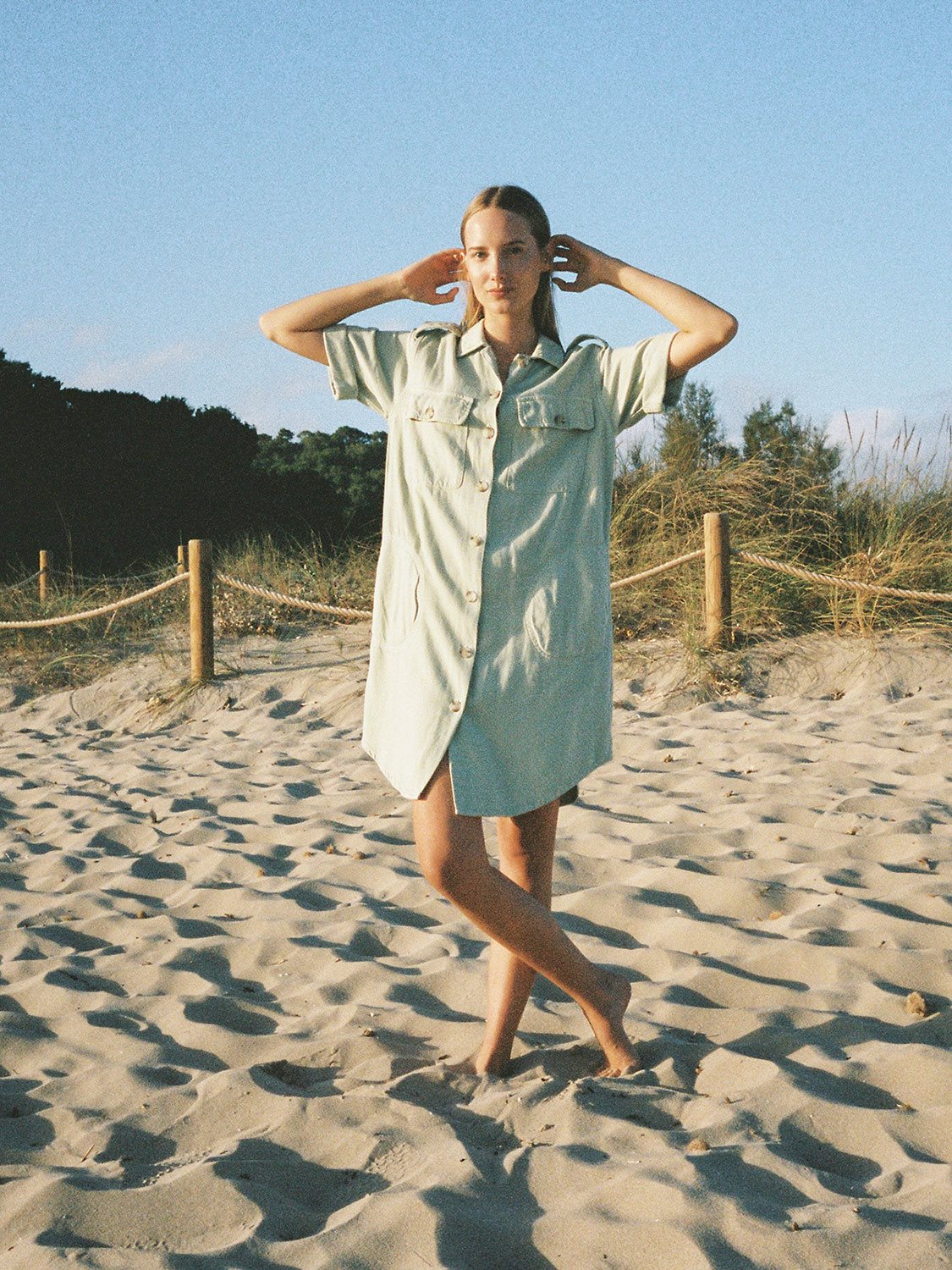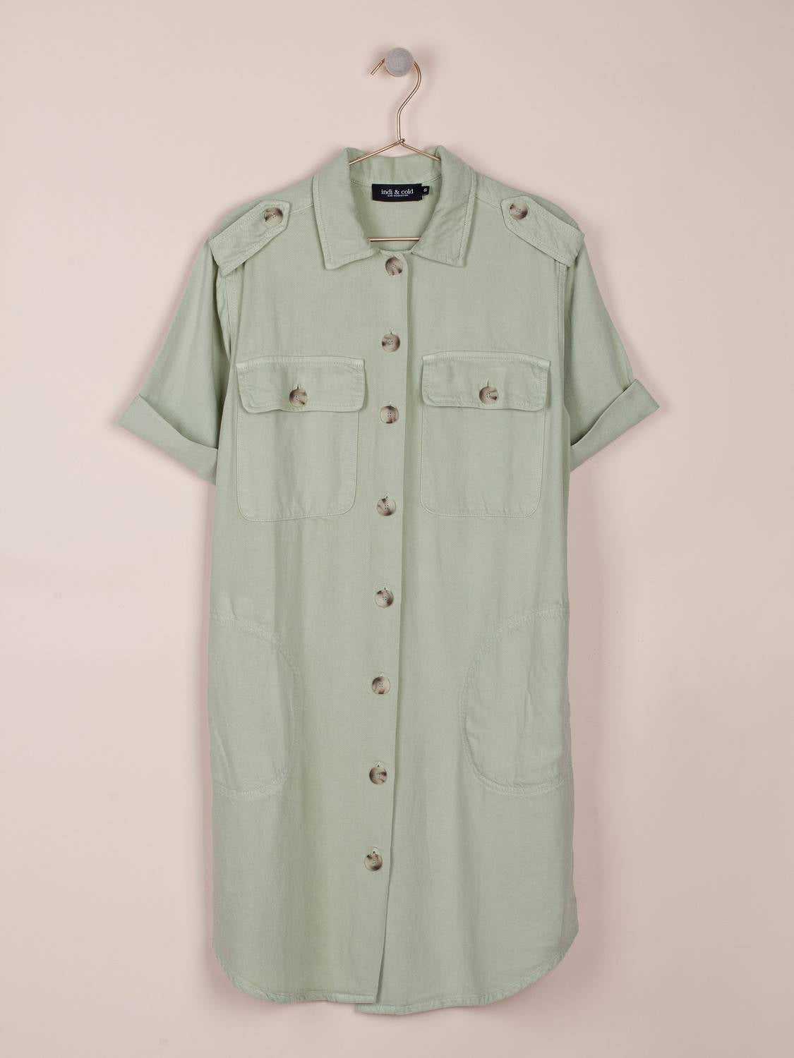 VESTIDO CAMISERO CON BOLSILLO PLASTRÓN - Cuello solapa. - Manga corta con vuelta. - Cierre con botonadura central. - Bolsillos plastrón con tapeta y botón en parte delantera. - Detalle de trabilla con botón en el hombro.
