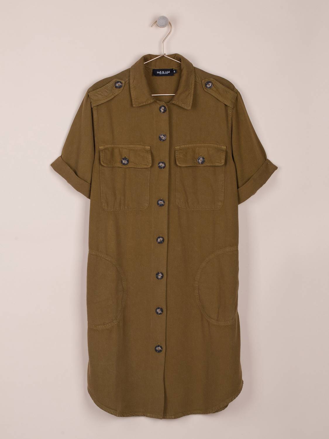 VESTIDO CAMISERO CON BOLSILLO PLASTRÓN - Cuello solapa. - Manga corta con vuelta. - Cierre con botonadura central. - Bolsillos plastrón con tapeta y botón en parte delantera. - Detalle de trabilla con botón en el hombro.