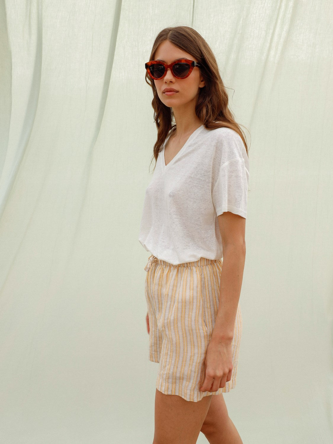 SHORT DE LINO CON RAYA TRICOLOR Y TINTE EN HILO